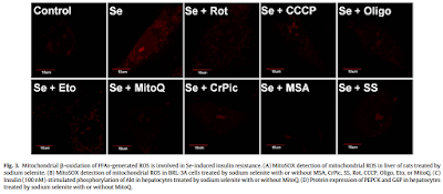 Control is from cells under RPMI 1640 alone, traditionally 11mmol/l glucose. Excess selenium blunts insulin signalling so allows FFA release from intracellular triglyceride stores, so increases ROS (in the same way as metformin does but w/o the suppression of gluconeogenesis intrinsic to metformin's action). Adding rotenone, as you would expect, blocks RET so blocks ROS generation. CCCP uncouples respiration, drops delta psi so blocks RET/ROS. Etomoxir blocks access of FFAs to mitochondria so blocks input at mtETFdh, so blocks RET/ROS. MitoQ powerfully targets all mitochondrial ROS so over-rides the FFA oxidation ROS generation effect. Chromium picolinate restores insulin signalling by repleting the Cr depletion induced by Se. MSA is an inhibitor of glutathione peroxidase, so it eliminates the effects of excess GPX. And SS, sodium salicylate, appears to block intracellular lipolysis in hepatocytes, so suppresses fatty acid supply to mitochondria, much as insulin or etomoxir would.
